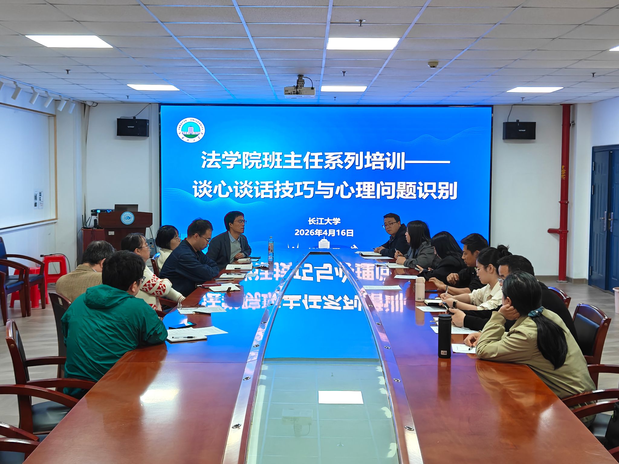 (通讯员 郭孟桃)为进一步强化班主任育人职责,提升班主任谈心谈话能力与学生心理问题识别水平,切实做好学生心理健康教育与管理工作,2026年4月16日下午,法学院在文科大楼1110会议室隆重举办班主任谈心谈话与心理问题识别专项培训,学院全体班主任悉数参会。本次培训由学生心理健康中心心理咨询办公室主任曹国光担任主讲人。法学院学工办主任盛文军主持培训会。