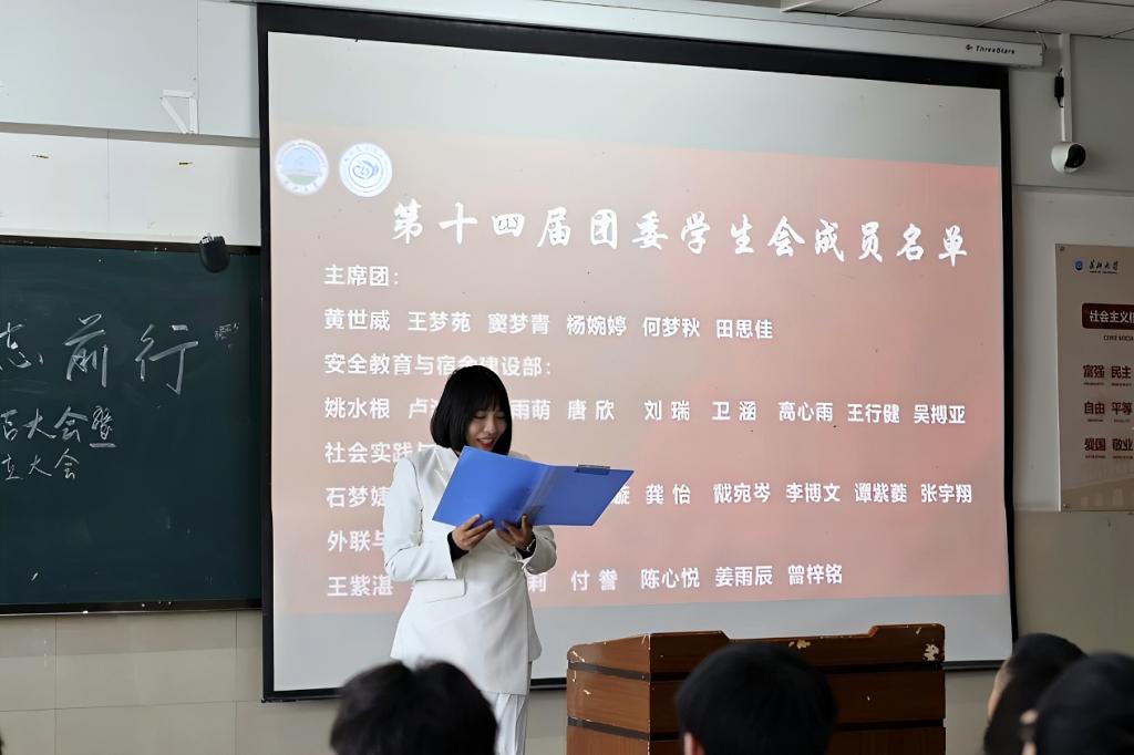 大会第四项,团委书记吴敏宣读第十四届团委学生会成员名单,对新成员的加入表示热烈欢迎。新鲜血液的注入,为学生会带来了新的活力与可能。紧接着,第十四届团委学生会主席团成员代表黄世威作表态发言,围绕 “深耕学风建设,营造优良学术氛围”“彰显专业特色,打造品牌文化活动”“强化服务意识,切实解决同学需求” 三个核心方向作出工作承诺,清晰的规划与坚定的态度,充分展现了新一届主席团的责任担当。