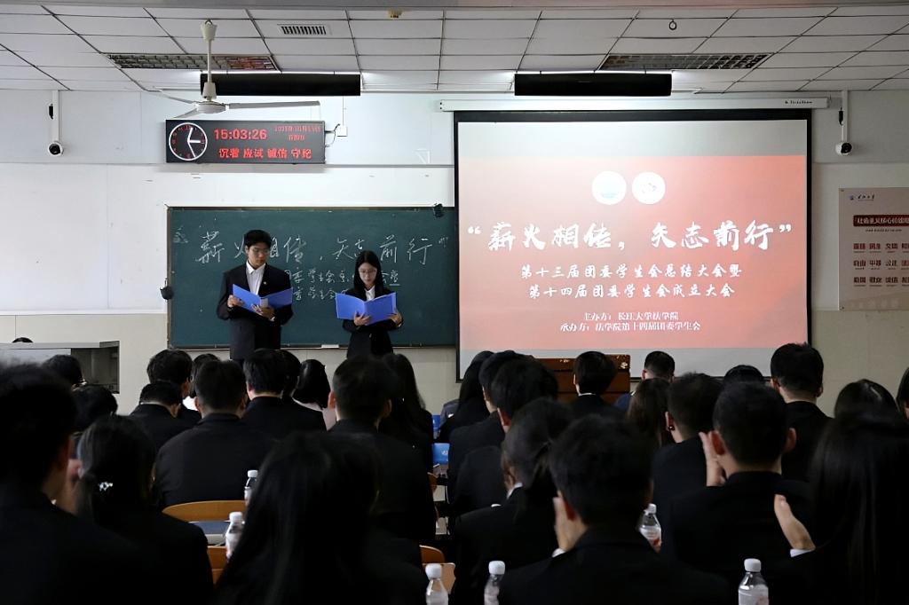 (通讯员 黄淇琪 / 文 杨欣瑶 林元腾 / 摄)10 月 19 日下午,长江大学法学院于东校区 12 教 204 教室隆重召开第十三届团委学生会总结大会暨第十四届团委学生会成立大会。法学院院长李华成、党委副书记严星、本科生党支部书记雷礼、团委书记吴敏出席会议,第十三届与第十四届团委学生会全体成员齐聚现场,共同见证这一承前启后的重要时刻。