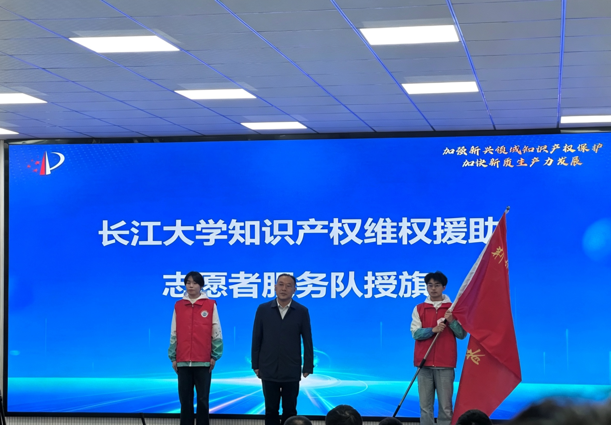 本次活动由荆州市市场监督管理局(荆州市知识产权局)、荆州市科学技术协会、长江大学联合主办,长江大学科学技术发展研究院、湖北省知识产权培训(荆州)基地承办。启动仪式上,长江大学科学技术发展研究院常务副院长徐辉结合地方产业发展实际,强调高校在知识产权人才培养、成果转化中的重要责任与使命。志愿者代表刘轩、肖天宇从荆州市副市长严广超手中接过队旗,正式加入荆州市知识产权志愿服务队。旗帜所承载的,既是荣誉与认可,更是传播知识产权理念、服务创新发展的时代责任。