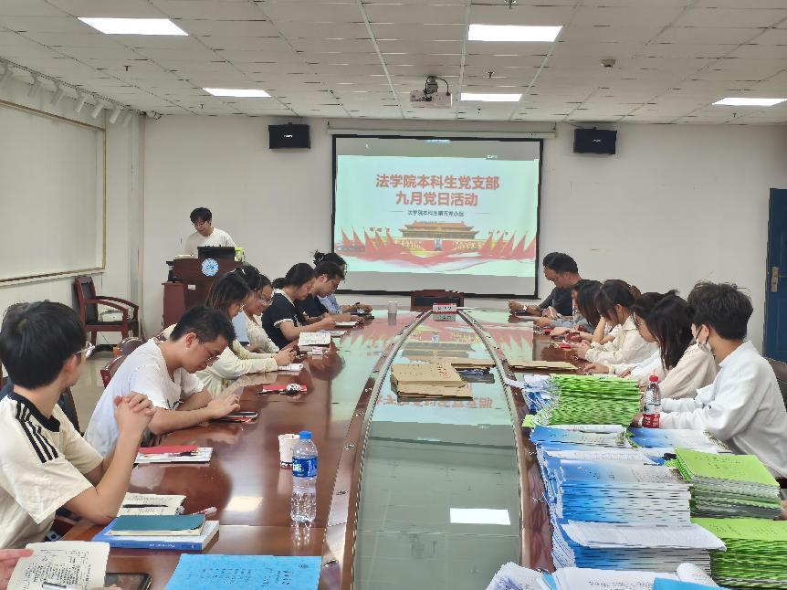 2024年9月23日法学院本科生党支部于文科大楼1110会议室开展9月主题党日活动。由秦坤蕾同志主持会议,法学院本科生党员全体参加。