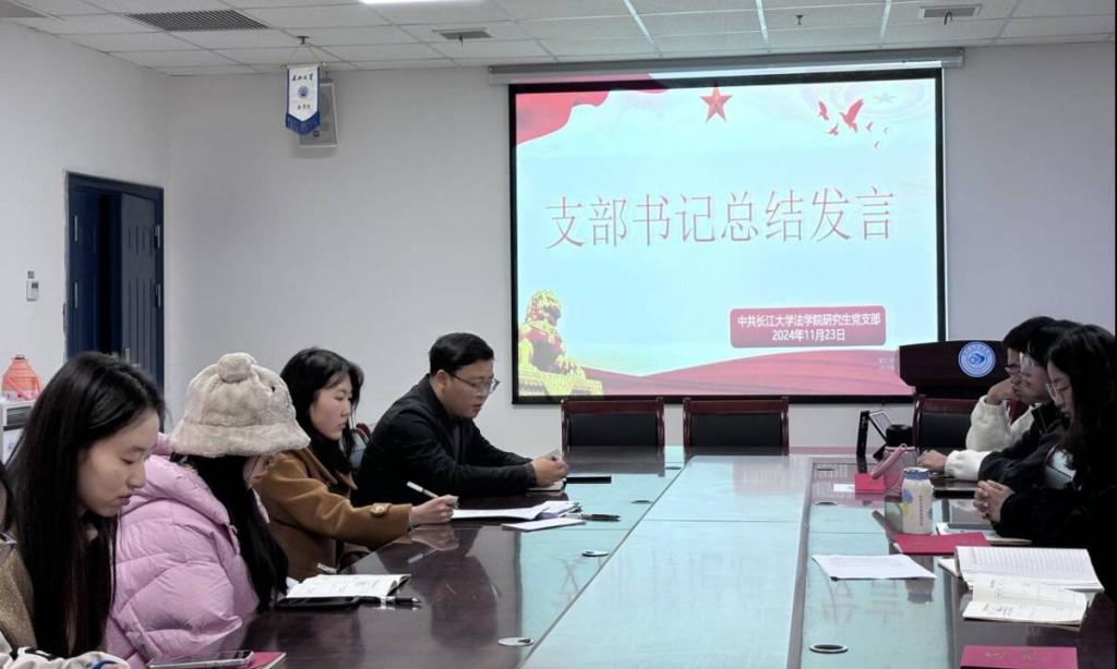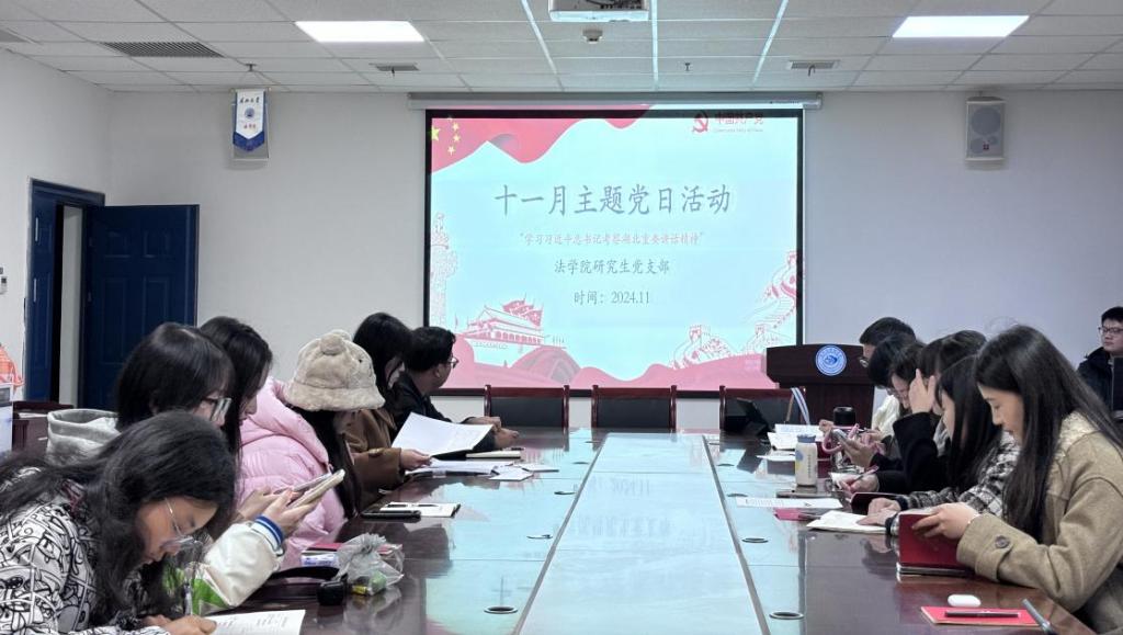 (通讯员 肖芳)2024年11月23日19时,法学院研究生党支部在文科大楼203会议室隆重举行了2024年下半年接收预备党员、预备党员转正大会,并以此为契机,同步开展了内容丰富、意义深远的11月主题党日活动。本次活动由田博文同志主持,支部全体党员积极参与,共同见证了党组织的发展与壮大。