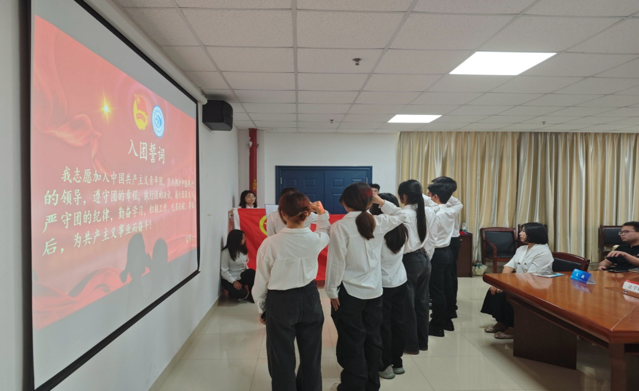 仪式在庄严的国歌声中拉开帷幕。主持人向若涵宣读新团员名单,雷礼老师与吴敏老师依次为新团员颁发团徽和团员证。闪耀的团徽佩戴在胸前,象征着共青团员的责任与荣光。随后,全体新团员面向团旗庄严宣誓,铿锵有力的誓言响彻会场:“我志愿加入中国共产主义青年团…… 为共产主义事业而奋斗!” 这一庄严承诺,既是对共青团的忠诚告白,更是对青春使命的郑重担当。