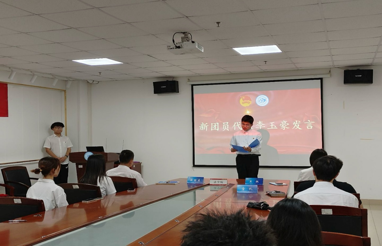 法学 32404 班李玉豪同学作为新团员代表发言,他深情表达对团组织的向往,承诺将以团员标准严格要求自己,在学习与实践中锤炼品格、增长才干。法学 12302 班王梦苑同学作为优秀团员代表分享成长心得,她鼓励新团员主动学习党团理论,在志愿服务、学术竞赛等活动中发挥先锋模范作用,用实际行动诠释共青团员的先进性。